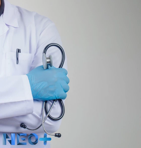 Врач в синей перчатке держит стетоскоп в правой руке